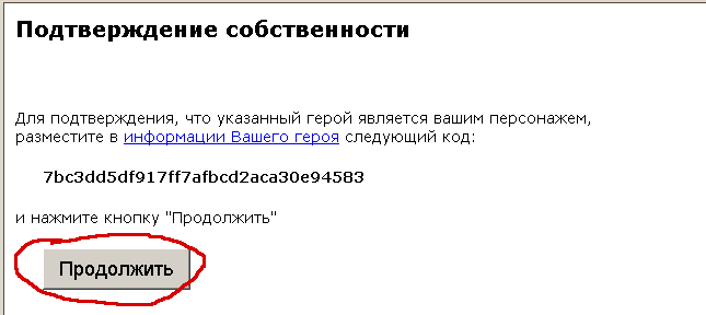 Если ник или id персонажа указаны верно, то загрузится страница "Подтверждение собственности", в противном случае будет выведена надпись о том, что персонаж в игре не найден.